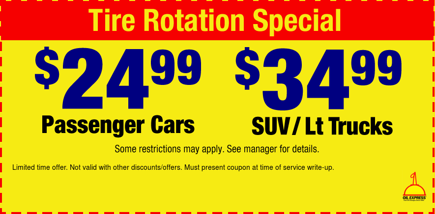 Tire Rotation Special $24.99 Passenger Cars/$34.99 SUV/Lt Truck